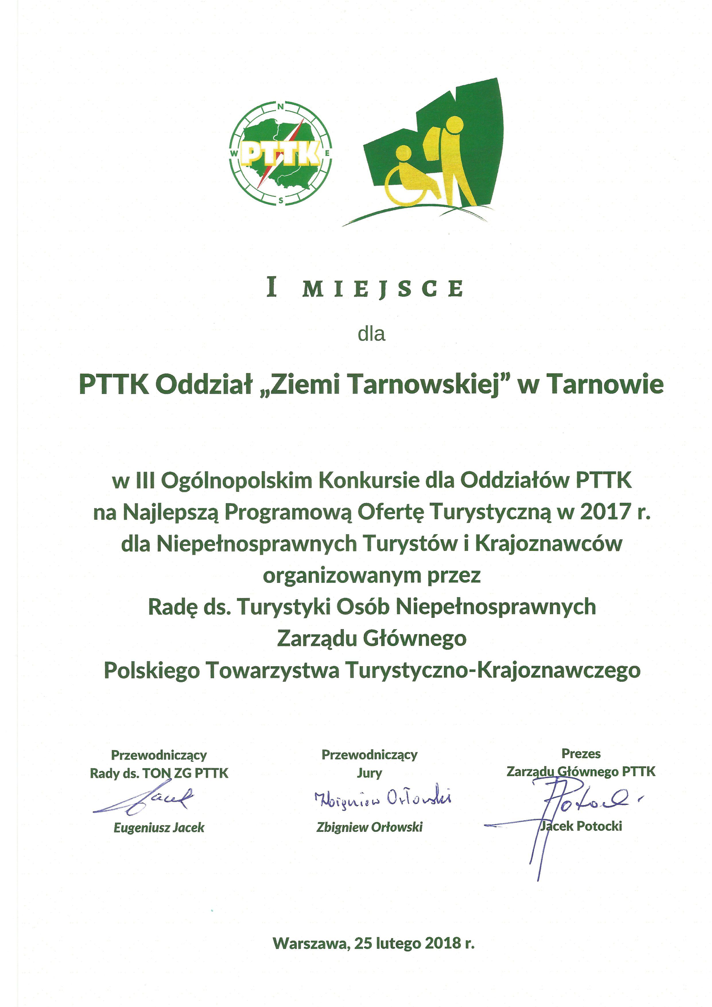 III Ogólnopolski Konkurs dla Oddziałów PTTK na najlepszą programową ofertę turystyczną realizowaną dla niepełnosprawnych turystów i krajoznawców w 2017 r.